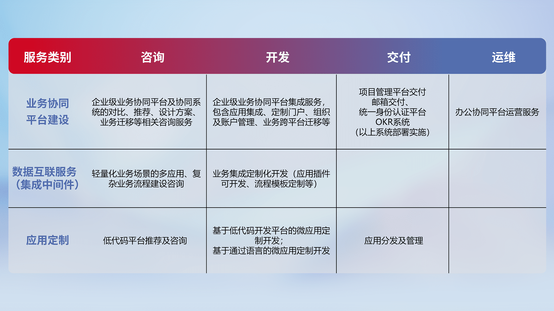 针对钉钉、、企微、、、IDaas等平台级产品提供产品的规划、、、方案、、交付、、、定制化开发等服务,,实现如统一协同办公、、智能客户服务、、、混合会议管理、、、、智能数据查询、、、、等业务场景,,实现数字化转型。。。。